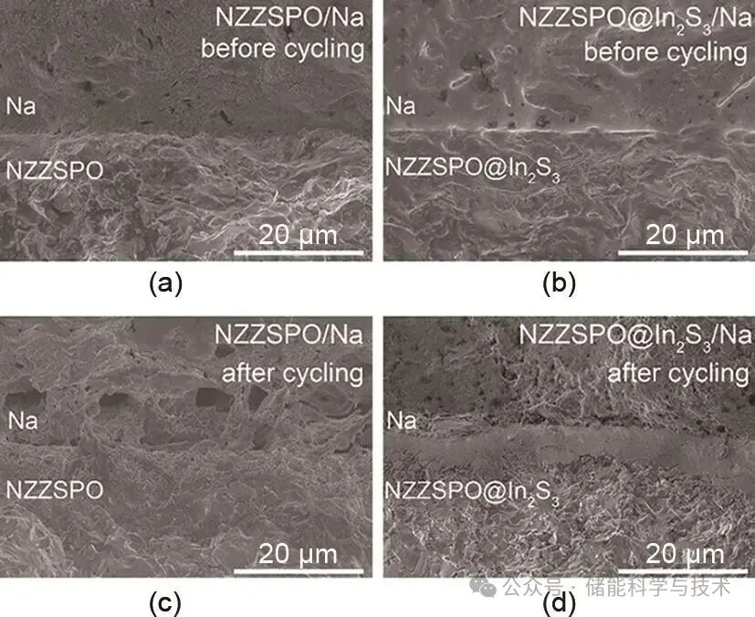 圖7 循環(huán)前后的 (a),(c) NZZSPO和 (b),(d) NZZSPO@In2S3固體電解質(zhì)負(fù)極側(cè)的橫截面SEM圖像