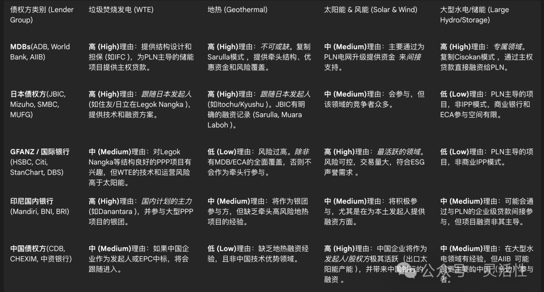 過(guò)去十年的格局: 印尼電力融資市場(chǎng)呈現(xiàn)出清晰的“四分格局”。多邊開(kāi)發(fā)銀行(MDBs)(如世界銀行、亞洲開(kāi)發(fā)銀行)扮演著“市場(chǎng)啟動(dòng)者”和“政策錨點(diǎn)”的角色,為電網(wǎng)和高風(fēng)險(xiǎn)可再生能源提供基礎(chǔ)融資和去風(fēng)險(xiǎn)工具。出口信貸局(ECAs)(特別是日本國(guó)際協(xié)力銀行 JBIC)是“發(fā)起人追隨者”,其巨額貸款與其本國(guó)企業(yè)(發(fā)起人或EPC)的利益高度綁定。國(guó)際商業(yè)銀行(以日本三大銀行和新加坡銀行為首)是“風(fēng)險(xiǎn)規(guī)避的參與者”,它們依賴MDBs和ECAs提供的“風(fēng)險(xiǎn)保護(hù)傘”參與銀團(tuán)。印尼國(guó)內(nèi)銀行(特別是國(guó)有銀行)則扮演著“戰(zhàn)略性填補(bǔ)者”的角色,在國(guó)內(nèi)政策指導(dǎo)下,為國(guó)際銀行因ESG(環(huán)境、社會(huì)和治理)壓力而退出的領(lǐng)域(特別是煤炭)提供資金。