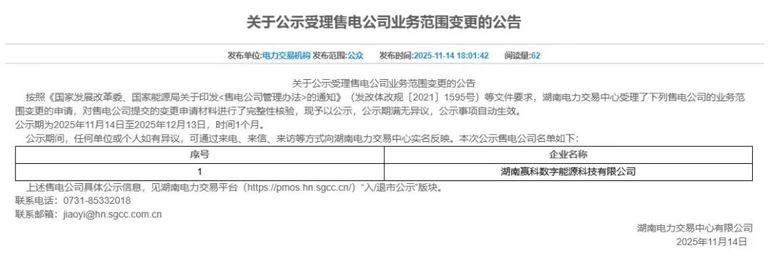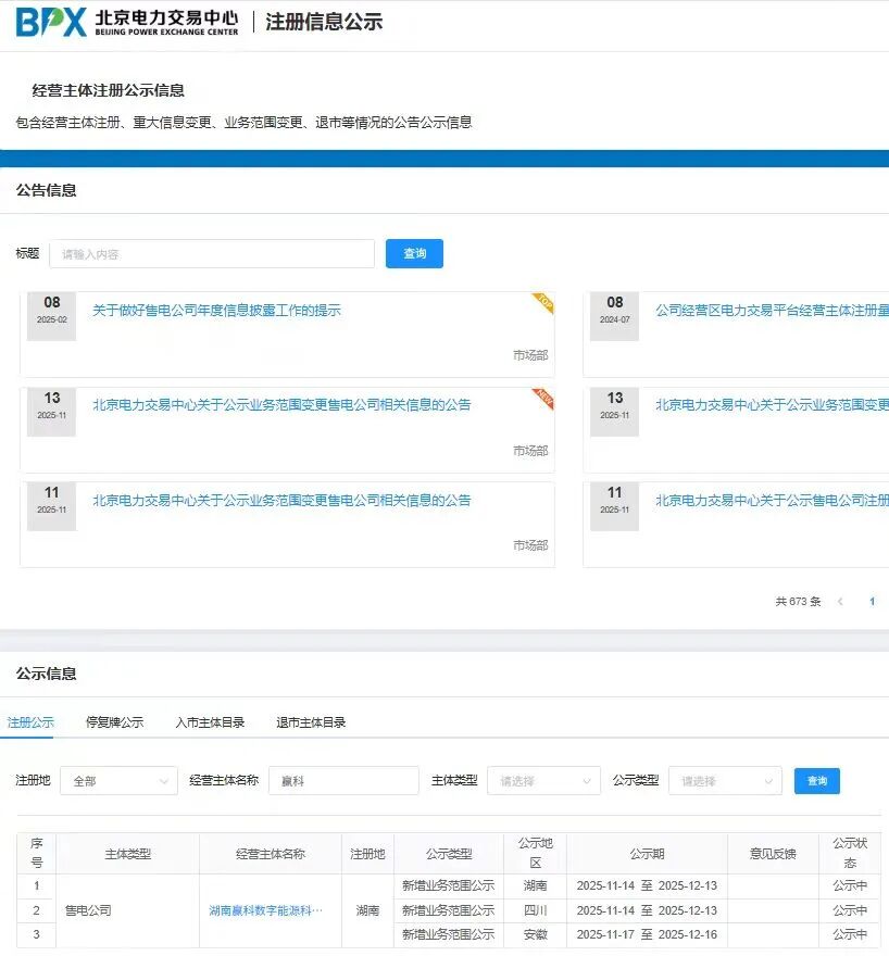 中國儲能網(wǎng)訊:根據(jù)北京電力交易中心最新公示信息,贏科數(shù)能(湖南贏科數(shù)字能源科技有限公司)已完成在四川、安徽兩省的業(yè)務范圍變更申請,具備兩省的售電資質(zhì)。