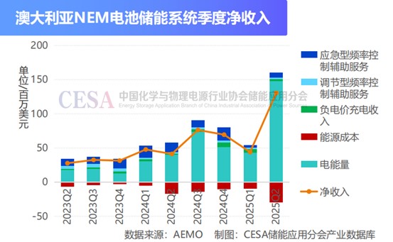 AEMO數(shù)據(jù)顯示,2025年二季度,澳大利亞能源套利凈收入大幅增長至1.208億美元,同比增長9550萬美元(+377%),占總凈收入的93%。能源放電收入預(yù)計(jì)達(dá)到1.481億美元,同比增長1.076億美元(+266%)。能源成本(收費(fèi)高于0美元/兆瓦時(shí))增加了1330萬美元(+80%),達(dá)到2980萬美元,而負(fù)電價(jià)充電收入增加了120萬美元(+84%),達(dá)到260萬美元。