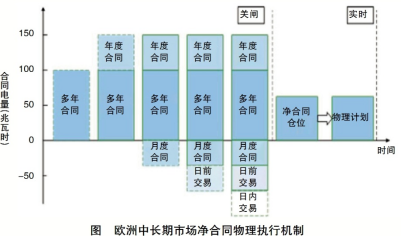從物理執(zhí)行的角度,電力市場只有現(xiàn)貨市場,沒有中長期市場;中長期市場只是服務(wù)于電力現(xiàn)貨市場價(jià)格風(fēng)險(xiǎn)管理的配套市場。由于這個(gè)原因,國外電力市場一般就是指現(xiàn)貨市場。美國電力市場主要是日前市場和實(shí)時(shí)市場,專門用于現(xiàn)貨市場價(jià)格風(fēng)險(xiǎn)管理的電力金融市場完全由專門金融機(jī)構(gòu)組織,不納入電力市場范圍。歐洲統(tǒng)一電力市場雖然有中長期市場,甚至統(tǒng)計(jì)的交易電量規(guī)?;虮壤容^大,但是這個(gè)市場其實(shí)主要也是金融性的,即用于市場經(jīng)營主體通過套利機(jī)制規(guī)避現(xiàn)貨市場價(jià)格風(fēng)險(xiǎn),而不是物理執(zhí)行。如圖所示,在歐洲統(tǒng)一電力市場中,市場經(jīng)營主體可開展多年、年度、月度中長期交易合同,中長期合同與日前合同、日內(nèi)合同形成的凈合同才物理執(zhí)行。表面上看好像與目前我國電力市場相似,實(shí)際上,由于市場經(jīng)營主體可以超過發(fā)用電能力和反向申報(bào)(即發(fā)電企業(yè)可申報(bào)用電合同等),歐洲中長期市場具有非常明顯的金融性,即通過不同周期、不同地區(qū)和不同市場體系之間的套利機(jī)制,使各種市場的交易價(jià)格趨于一致,市場經(jīng)營主體規(guī)避了價(jià)格風(fēng)險(xiǎn)。