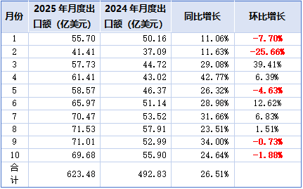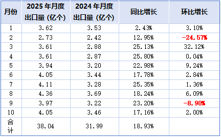 根據(jù)海關(guān)最新統(tǒng)計數(shù)據(jù),2025年1-10月鋰離子電池出口數(shù)量為38.04億個,同比增長18.93%;2025年1-10月我國鋰離子電池出口額為623.48億美元,同比增加26.51%,延續(xù)了穩(wěn)定增長勢頭。其中,2025年10月份,出口額69.68億美元,同比增長24.64%,10月份,出口數(shù)量為4.05億個,同比增長17.16%。