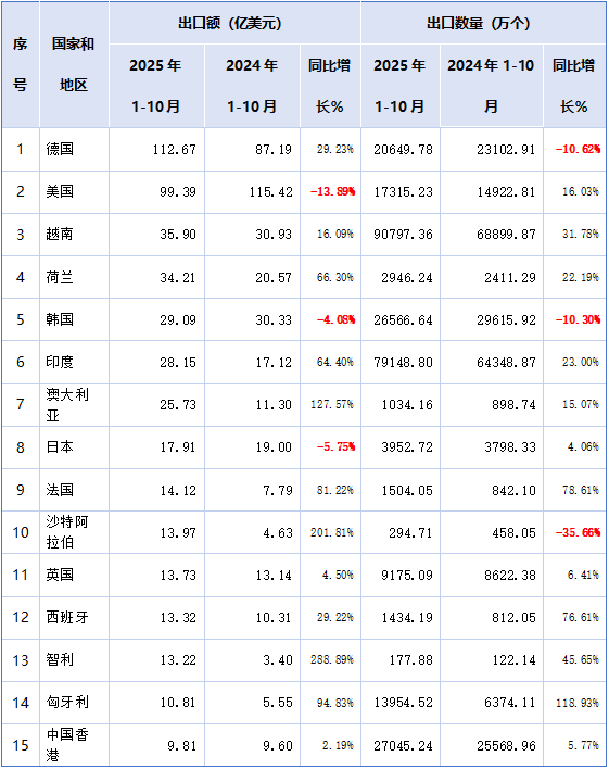 德國從5月份開始已經(jīng)取代美國成為我國鋰離子電池第一大出口市場,2025年1-10月出口金額為112.67億美元,同比增長29.23%,占我國鋰離子出口總額的18.1%。第二大市場為美國,1-10月出口總金額為99.39億美元,同比下降13.89%,占我國鋰離子電池出口額的15.9%。越南為第三大出口市場,出口金額為35.9億美元,同比增長16.09%,占我國鋰離子電池出口額的5.8%。前十大出口國家中,同比增幅最大的國家有智利、沙特阿拉伯、澳大利亞。
