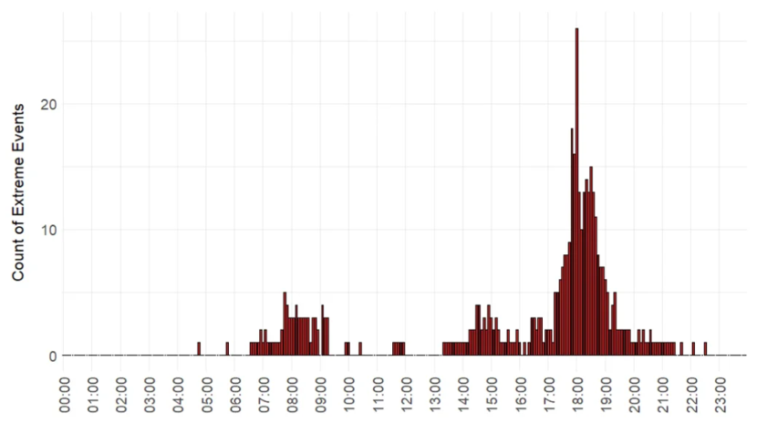 此外,波動發(fā)生時段更難預(yù)測。以往波動集中于傍晚高峰,如今已擴展至全天隨機發(fā)生。2024年更是出現(xiàn)下午2至3點的新聚集時段。圖2表明,當(dāng)年極端價格事件在16:00至18:00達(dá)到峰值。這種變化加大零售商的對沖需求與成本。