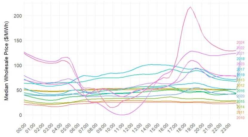 其三,鴨形曲線正在加劇。太陽能發(fā)電在電網(wǎng)中的滲透率提升正改變電價與需求特征。由于太陽能發(fā)電集中于中午,無法匹配傍晚高峰需求,導(dǎo)致白天電力供應(yīng)過剩、價格趨近于零甚至為負(fù)。而在傍晚需求激增時段,剩余發(fā)電機被推高價格。如圖4所示,各年份電價曲線均呈現(xiàn)典型鴨形結(jié)構(gòu)。電價在清晨與深夜較低,白天整體較高,并于19:00至20:00形成顯著尖峰。2021年與2024年該峰值尤為突出。這種曲線使每日成本嚴(yán)重偏向傍晚高峰時段,推高整體供電成本。為應(yīng)對此類結(jié)構(gòu)變化,零售商需采用更復(fù)雜的需求形態(tài)或負(fù)荷跟蹤對沖工具,從而增加風(fēng)險管理的復(fù)雜性與成本。