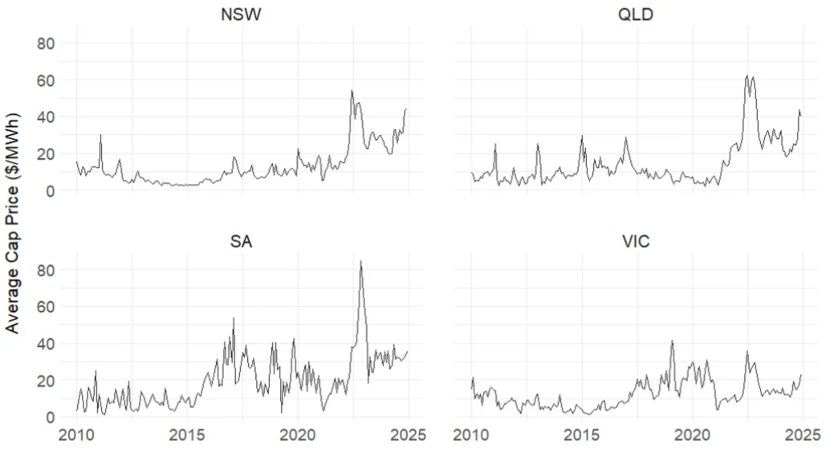其一,電力市場波動性正在加劇。一方面,價格上限大幅提升,從2010年的10,000美元/兆瓦時升至2025年的20,300美元/兆瓦時。同時,價格觸及上限頻率明顯增加。2018年前各州電價全年未觸頂,近年卻已成為常態(tài)。另一方面,電價波動幅度持續(xù)擴大。除極端事件外,近年電價的季度標(biāo)準(zhǔn)差也普遍高于2018年前水平。圖1顯示,南澳大利亞州(SA)電價標(biāo)準(zhǔn)差在四個地區(qū)中最高,峰值超過750 $/MWh,波動最為劇烈。