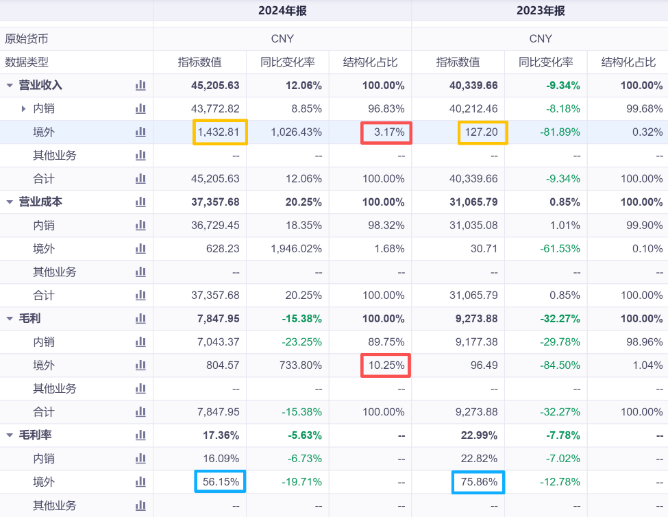成果也直接反映在財報中:公司境外收入從2023年的127萬元躍升至2024年的1433萬元,毛利率更是分別高達75.86%、56.15%,顯著高于公司整體20%左右的水平。盡管2024年境外收入占比僅3.17%,卻貢獻了10.25%的毛利,成為盈利結(jié)構(gòu)優(yōu)化的關(guān)鍵推力。