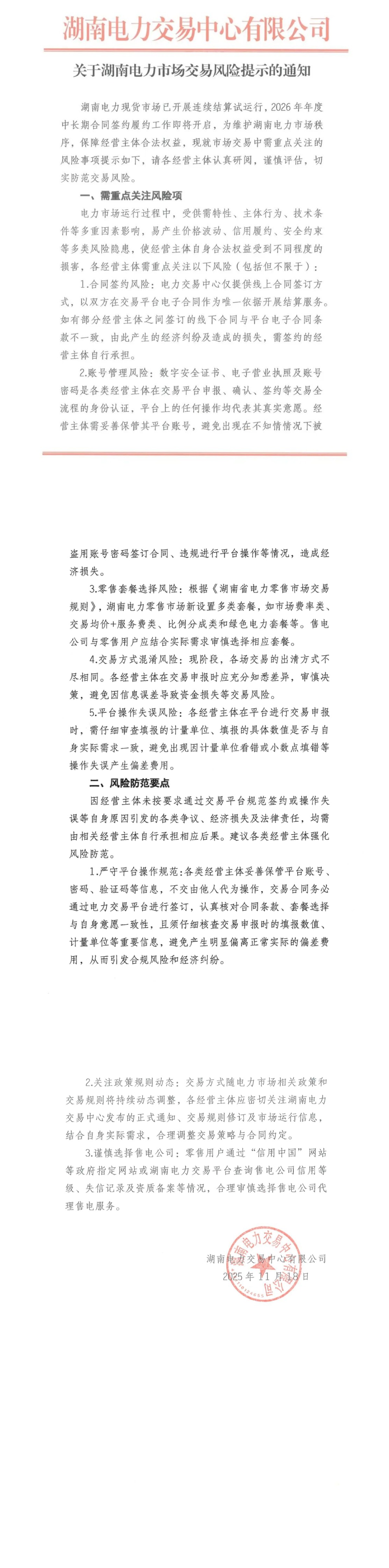 中國儲能網(wǎng)訊:湖南電力現(xiàn)貨市場已開展連續(xù)結(jié)算試運行,2026年年度中長期合同簽約履約工作即將開啟,為維護湖南電力市場秩序,保障經(jīng)營主體合法權(quán)益,現(xiàn)就市場交易中需重點關(guān)注的風險事項提示如下,請各經(jīng)菅主體認真研閱,謹慎評估,切實防范交易風險。