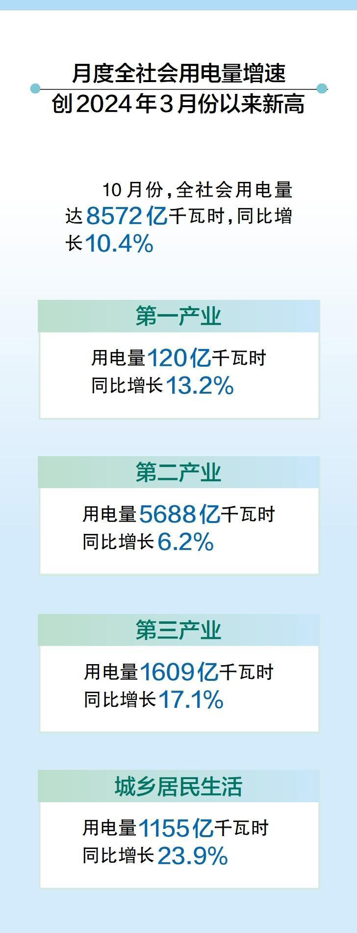 從電力消費(fèi)看,10月份,全社會(huì)用電量達(dá)8572億千瓦時(shí),同比增速達(dá)10.4%。國(guó)網(wǎng)能源研究院經(jīng)濟(jì)與能源供需研究所專家張莉莉介紹,這一增速創(chuàng)下2024年3月份以來(lái)月度全社會(huì)用電量增速新高。分產(chǎn)業(yè)看,10月份第一產(chǎn)業(yè)用電量為120億千瓦時(shí),同比增長(zhǎng)13.2%;第二產(chǎn)業(yè)用電量為5688億千瓦時(shí),同比增長(zhǎng)6.2%;第三產(chǎn)業(yè)用電量達(dá)1609億千瓦時(shí),同比增長(zhǎng)17.1%,其中,充換電服務(wù)業(yè)以及信息傳輸、軟件和信息技術(shù)服務(wù)業(yè)用電量增長(zhǎng)較快;城鄉(xiāng)居民生活用電量達(dá)1155億千瓦時(shí),同比增長(zhǎng)23.9%。