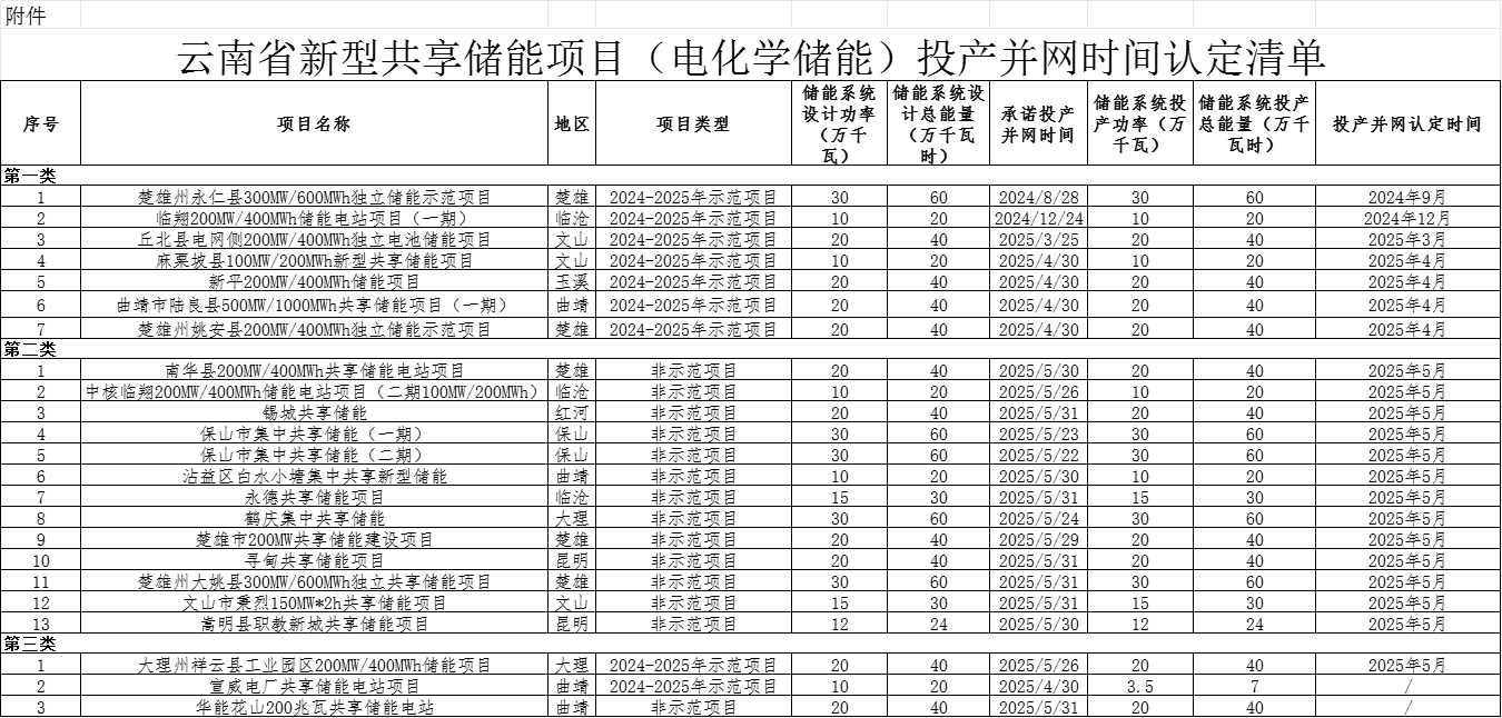 云南省能源局關于印發(fā)新型共享儲能項目(電化學儲能)投產(chǎn)并網(wǎng)時間認定清單的通知