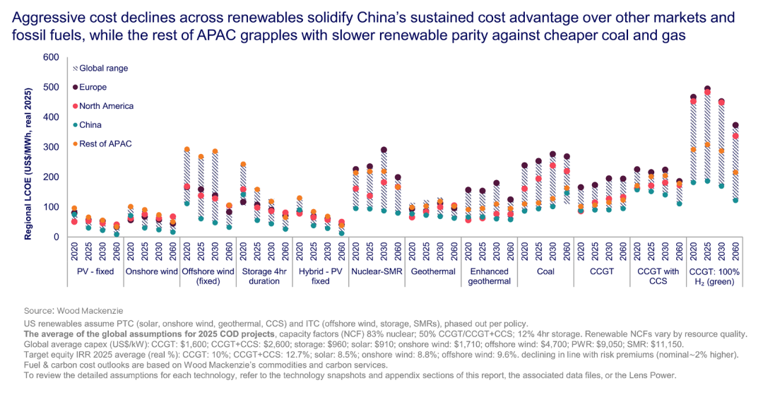 風(fēng)能和光伏技術(shù)推動(dòng)亞太地區(qū)電力市場發(fā)生了深刻的結(jié)構(gòu)性變革。到2025年,集中式光伏發(fā)電在整個(gè)亞太地區(qū)的發(fā)電成本最低,LCOE范圍從中國的27美元/兆瓦時(shí)到日本的118美元/兆瓦時(shí)不等。陸上風(fēng)電也極具競爭力,中國、印度和越南以25-70美元/兆瓦時(shí)的LCOE在全球處于領(lǐng)先地位。海上風(fēng)電成本因市場不同而差異巨大,中國展現(xiàn)出了良好的商業(yè)盈利潛力,而其他市場在本世紀(jì)30年代初將面臨成本上升的問題。
