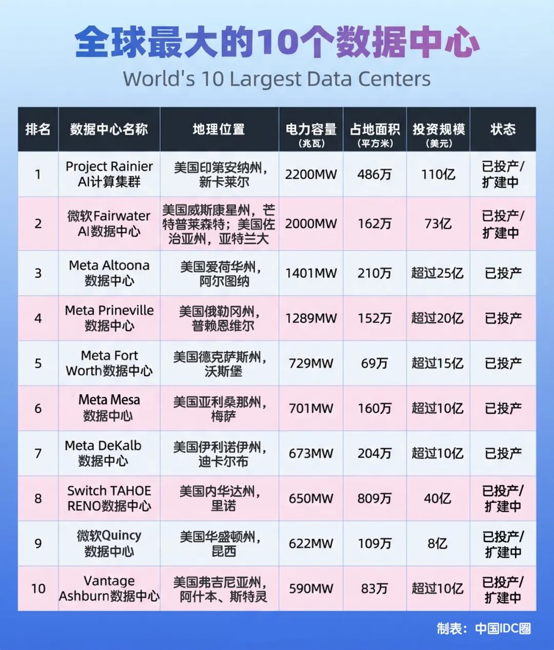 根據(jù)電力容量(MW)排名,世界上最大的10個數(shù)據(jù)中心: