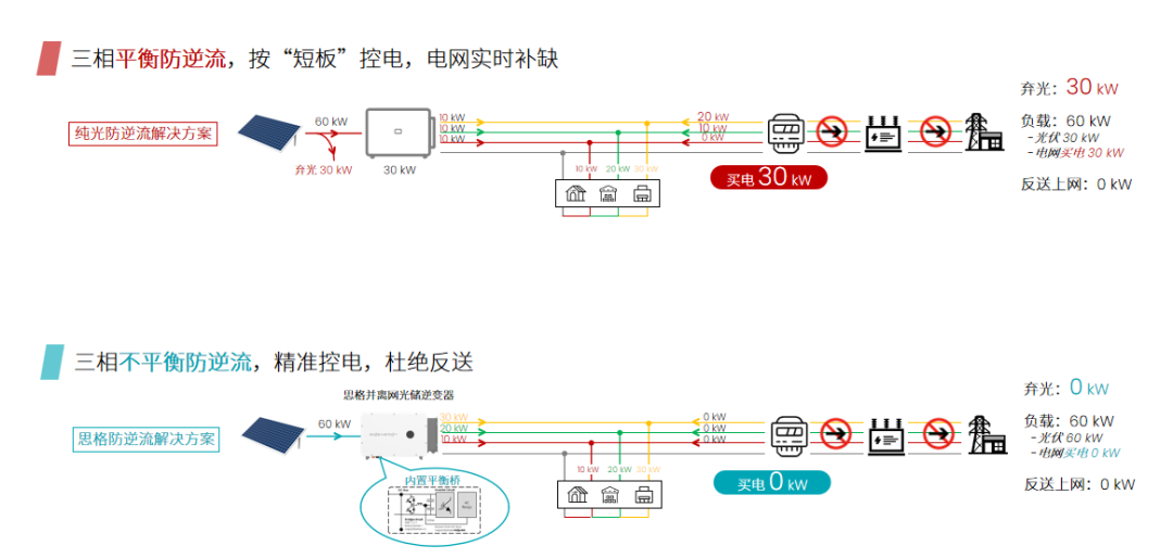 由于工商業(yè)負(fù)載往往天然“三相不平衡”:用電設(shè)備部分使用單相電源,部分使用三相電源,設(shè)備開啟時(shí)間和用電功率存在差異,很難保障三相用電負(fù)載相同,可能出現(xiàn)三相分別為 30 kW、20 kW、10 kW 這樣的情況。在防逆流場(chǎng)景下,傳統(tǒng)逆變器無(wú)法按需分配功率,系統(tǒng)只能按照最小相來(lái)限制整體輸出,剩余用電需要從電網(wǎng)取電。