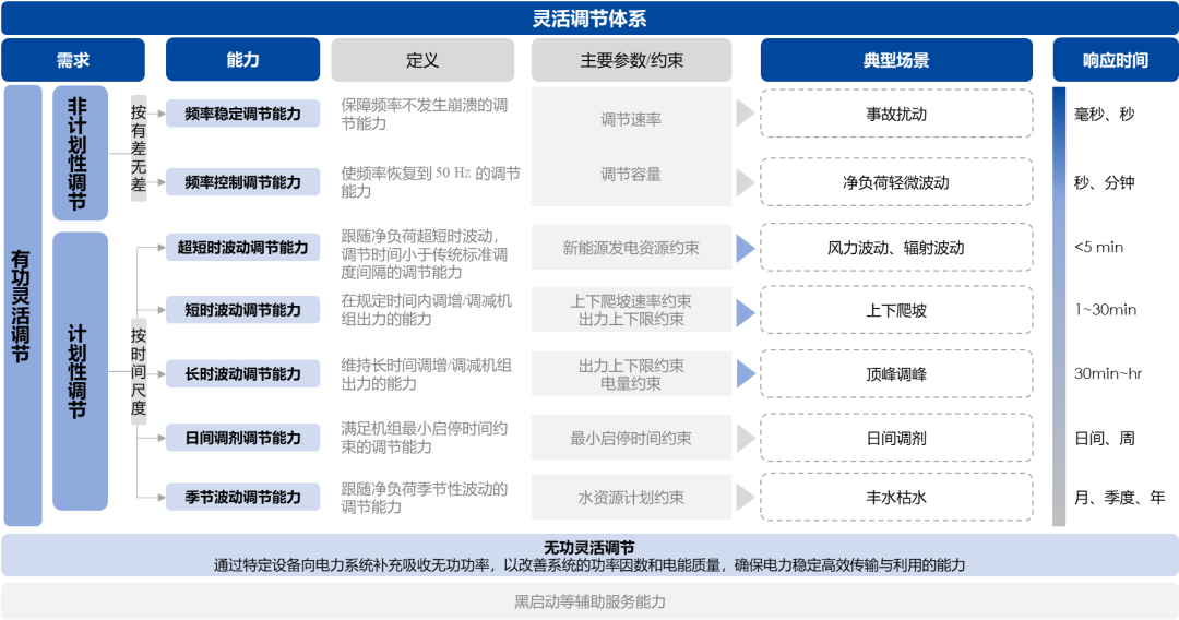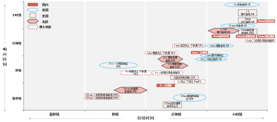 從國(guó)際經(jīng)驗(yàn)看,歐美等國(guó)家的靈活調(diào)節(jié)體系更強(qiáng)調(diào)非計(jì)劃性調(diào)節(jié),在頻率控制調(diào)節(jié)能力、頻率恢復(fù)調(diào)節(jié)能力上,有更細(xì)致的分級(jí)與更開放的市場(chǎng)。同時(shí),近年來持續(xù)細(xì)化顆粒度,新增了毫秒級(jí)響應(yīng)時(shí)間服務(wù)(美國(guó)的RegD、英國(guó)的EFR、北歐的FFR、澳大利亞的FFR1)。當(dāng)前,國(guó)內(nèi)進(jìn)入輔助服務(wù)市場(chǎng)交易的產(chǎn)品以調(diào)峰輔助服務(wù)居多,國(guó)外成熟電力市場(chǎng)體系中均未設(shè)置調(diào)峰輔助服務(wù),相關(guān)能力的價(jià)值通過在現(xiàn)貨主能量市場(chǎng)中解決;國(guó)內(nèi)外在超短時(shí)波動(dòng)調(diào)節(jié)能力上,都存在較大空缺。隨著接入電網(wǎng)的可再生能源及電力電子裝備的比例日益增大,在超短時(shí)的時(shí)間尺度上的靈活調(diào)節(jié)充裕度或?qū)⑹艿教魬?zhàn)。各國(guó)靈活調(diào)節(jié)能力產(chǎn)品的性能要求如下圖所示。