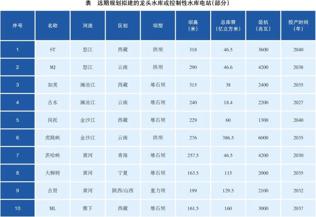一是積極推動雅魯藏布江下游水電開發(fā),推動西藏清潔能源基地開發(fā)論證;二是加快河流龍頭水庫或控制性水庫建設(shè)(見表),增強梯級綜合利用效益;三是推動水電基地升級為更大規(guī)模的水風(fēng)光儲一體化清潔能源基地,加快流域水風(fēng)光儲互補開發(fā)規(guī)劃論證,推動水電機組改造和擴機;四是在加快建設(shè)抽水蓄能電站的同時,推動梯級水電儲能工廠建設(shè),因地制宜配置新型儲能。