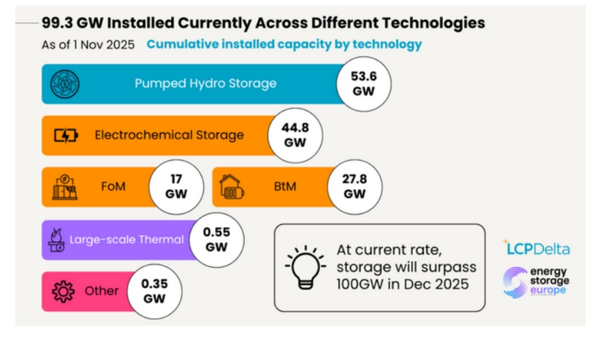 中國儲能網(wǎng)訊:根據(jù)LCP Delta和歐洲儲能協(xié)會(ESEA)最新分析,截至11月初,歐洲迄今為止累計(jì)部署的儲能系統(tǒng)裝機(jī)量有望達(dá)到100GW。