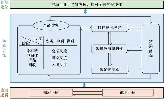 圖1展示了產品碳足跡核算的總體框架,包括目標定位、核算方法與底層邏輯3個方面。碳足跡核算的根本目的是推動行業(yè)可持續(xù)發(fā)展,應對氣候變化,用于橫向比較同行業(yè)不同企業(yè)的產品碳足跡結果、縱向比較企業(yè)自身產品碳足跡變化。據(jù)此需建立統(tǒng)一規(guī)范的碳足跡核算原則與方法,確保各產業(yè)各節(jié)點測算結果的一致性與可比性。在LCA的方法框架下,產品碳足跡核算包括4個基本步驟:目標范圍界定、碳排放清單構建、碳足跡測算、結果闡釋。4個步驟間兩兩交互反饋,根據(jù)碳足跡評估結果與應用目標,不斷迭代,以提高核算的準度與精度,同時針對產品碳排放熱點環(huán)節(jié)靶向開展降碳措施。碳足跡核算結果還可以直接應用于產品開發(fā)與優(yōu)化(生態(tài)設計)、企業(yè)可持續(xù)發(fā)展戰(zhàn)略規(guī)劃、公共政策制定、市場營銷、產品碳足跡標識與生態(tài)標志(環(huán)境標識)等方面。在確定核算的系統(tǒng)邊界時,需根據(jù)LCA方法原理,追溯其原料、中間體、產品、回收各階段的供應鏈構成。雖然產品碳足跡核算的方法原理清晰,但由于在全球化背景下,供應鏈涉及全球、國家、區(qū)域等不同尺度,導致實踐中面臨碳足跡核算具體操作復雜、結果異質性高的挑戰(zhàn)。這就需要穩(wěn)健的物質平衡與能量平衡的底層邏輯支撐,即針對產品每個階段的單元過程,建立物質輸入輸出平衡、能流輸入輸出清單,在此基礎上再形成產品的高分辨碳排放清單,測算其碳足跡。