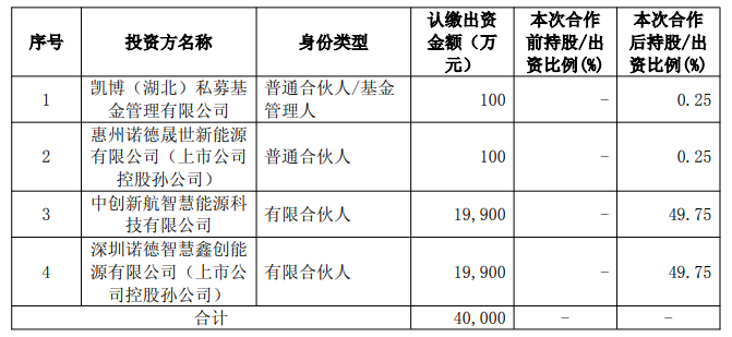 該基金以有限合伙形式組建,擬定名稱(chēng)為凱博諾德先進(jìn)儲(chǔ)能(湖北)私募股權(quán)投資基金合伙企業(yè)(有限合伙)?;鹨?guī)模4億元,其中,中創(chuàng)新航智慧能源作為L(zhǎng)P認(rèn)繳出資1.99億元,占比49.75%,諾德智慧鑫創(chuàng)能源作為L(zhǎng)P認(rèn)繳出資1.99億元,占比49.75%;凱博資本作為管理人/GP1認(rèn)繳出資100萬(wàn)元,惠州諾德晟世作為GP2認(rèn)繳出資100萬(wàn)元。后續(xù),基金可以通過(guò)擴(kuò)募或設(shè)立子基金方式引進(jìn)政府資金、社會(huì)資本及產(chǎn)業(yè)資本等。
