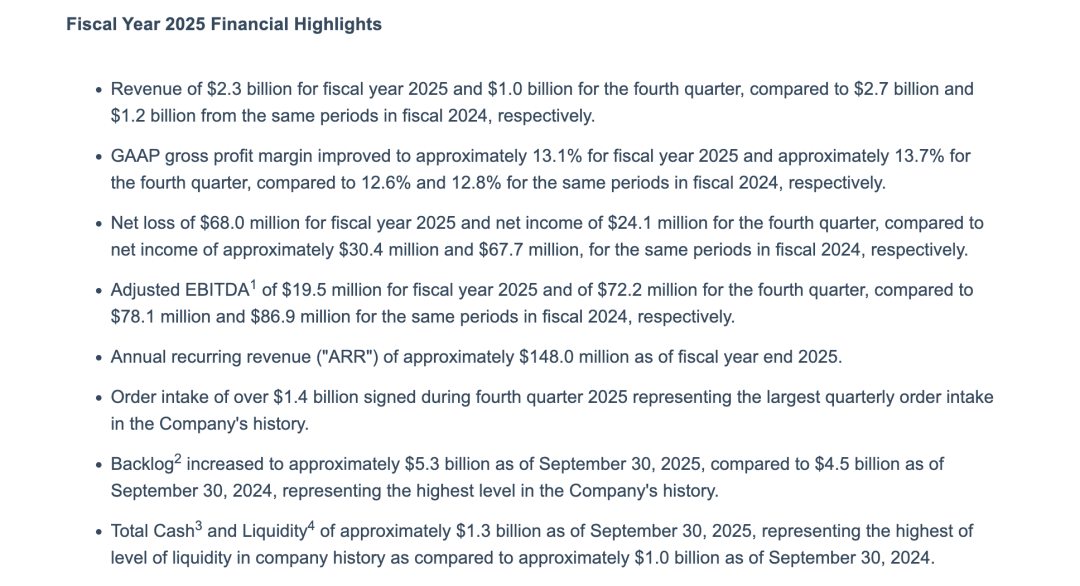 從數(shù)據(jù)上看,F(xiàn)luence 的項(xiàng)目交付量仍在增長(zhǎng)。公司在2025財(cái)年第四季度簽訂新訂單14億美元,創(chuàng)下單季紀(jì)錄。但盡管項(xiàng)目數(shù)量上升,利潤(rùn)卻下滑(2025財(cái)年凈虧損6800萬(wàn)美元),說明單項(xiàng)目收入(ASP)出現(xiàn)下行。