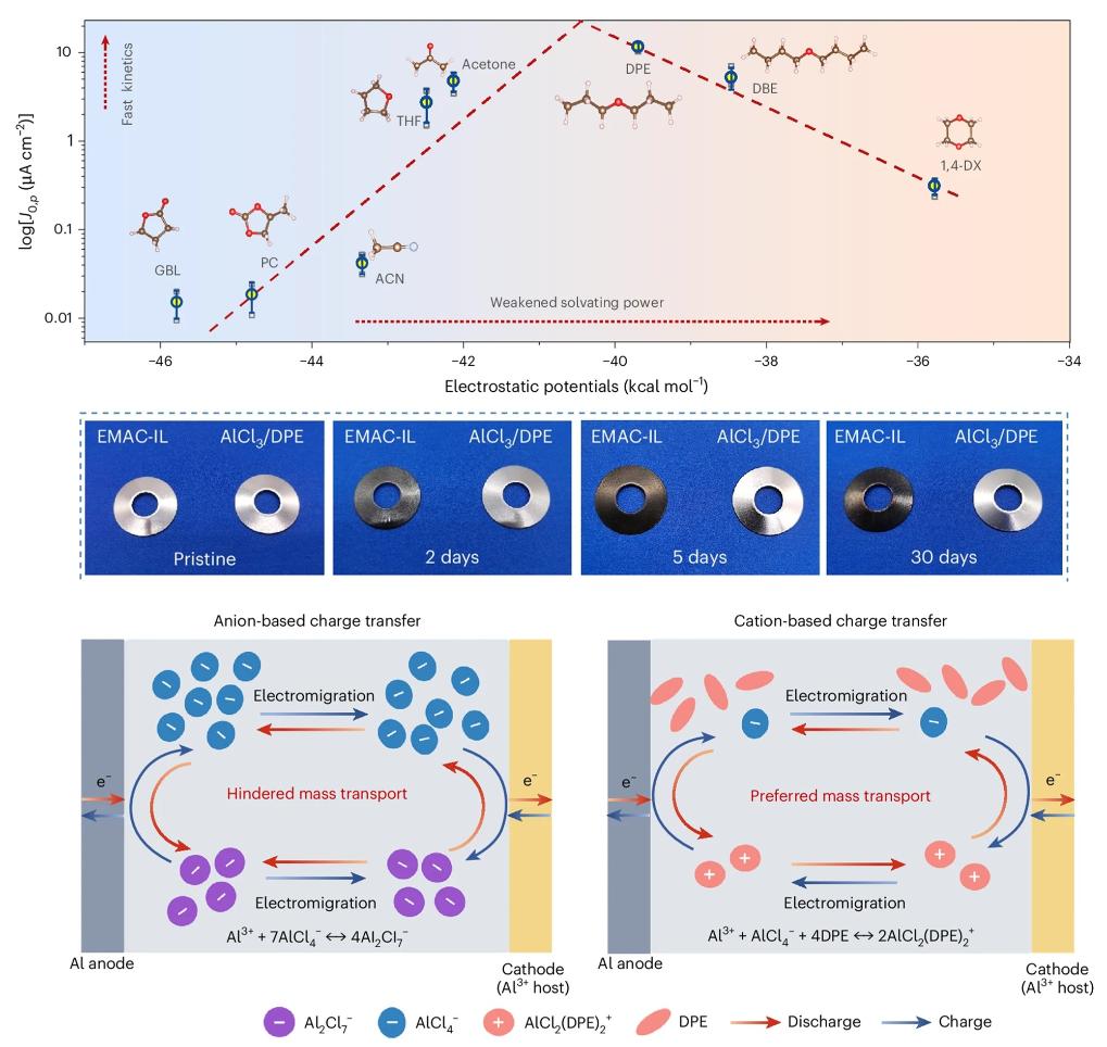 項(xiàng)目團(tuán)隊(duì)開創(chuàng)性提出“有機(jī)雙氯”溶劑化電解液設(shè)計策略,以氯化鋁/正丙醚有機(jī)體系替代傳統(tǒng)離子液體,通過精確調(diào)控溶劑化結(jié)構(gòu),將腐蝕性氯離子“限域”在鋁離子周圍,顯著降低腐蝕性的同時提升電化學(xué)可逆性。