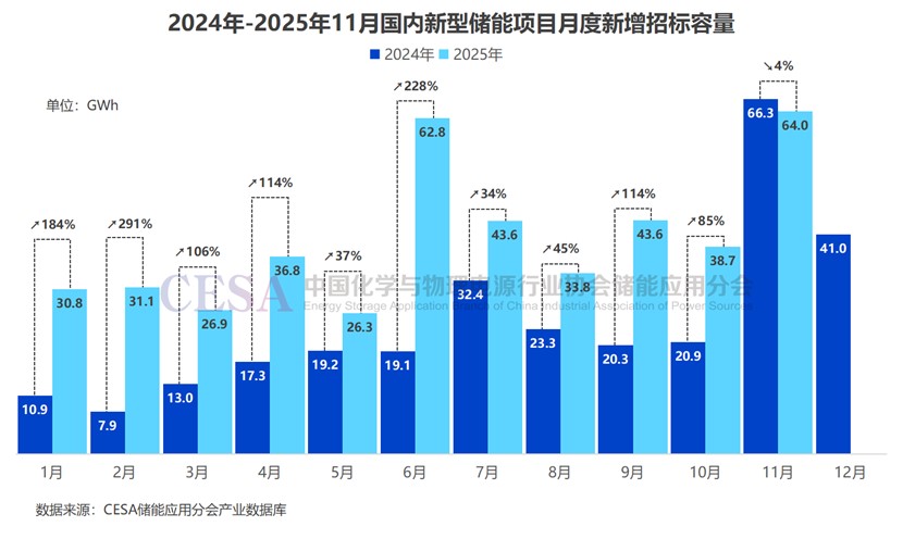 從累計(jì)表現(xiàn)看,2025年1-11月,國(guó)內(nèi)新型儲(chǔ)能新增招標(biāo)規(guī)模已突破400GWh,較之去年同比增長(zhǎng)75%。