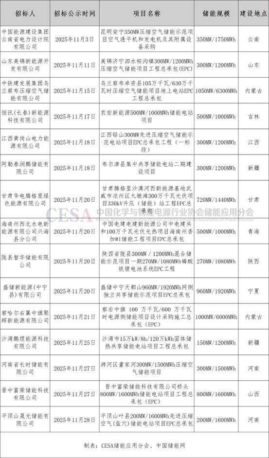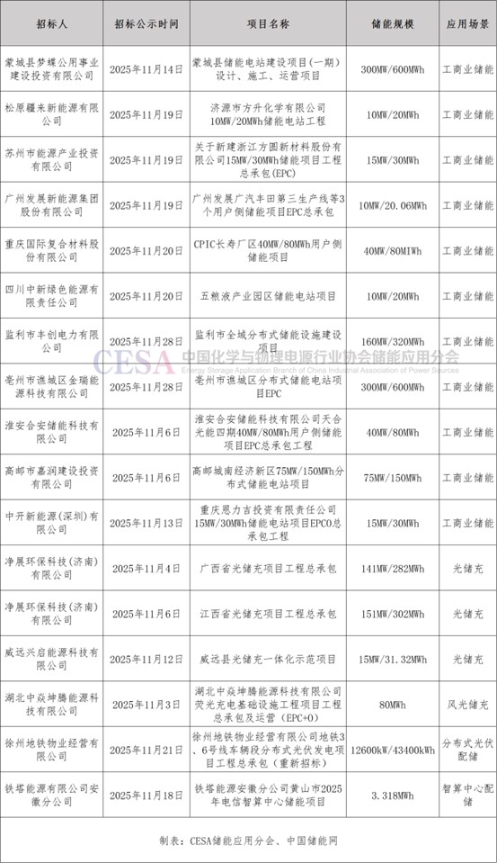 表 2025年11月國(guó)內(nèi)新增GWh級(jí)儲(chǔ)能招標(biāo)項(xiàng)目
