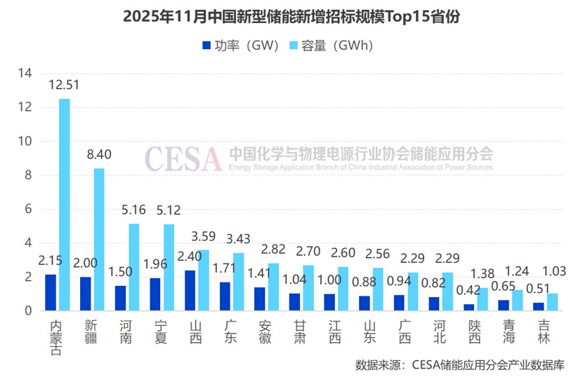 11月儲(chǔ)能新增招標(biāo)項(xiàng)目總?cè)萘恳?guī)模 Top5 省份依次為:內(nèi)蒙古、新疆、河南、寧夏、山西;總功率規(guī)模 Top5 省份為:山西、內(nèi)蒙古、新疆、寧夏、廣東。