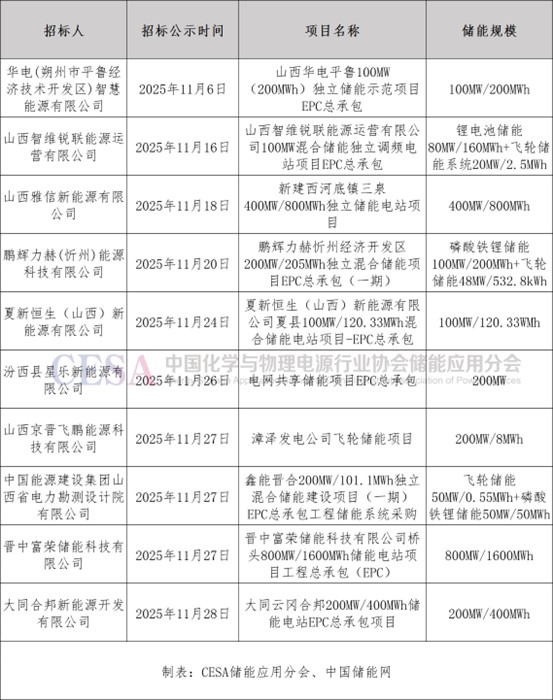 表 2025年11月山西新增招標(biāo)儲(chǔ)能項(xiàng)目