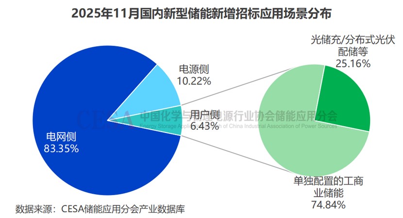 據(jù)CESA儲(chǔ)能應(yīng)用分會(huì)不完全統(tǒng)計(jì),2025年11月國(guó)內(nèi)應(yīng)用場(chǎng)景明確的儲(chǔ)能新增招標(biāo)項(xiàng)目規(guī)模達(dá)21.6GW/62.93GWh,其中電網(wǎng)側(cè)儲(chǔ)能新增招標(biāo)18GW/51.29GWh,占比83.35%(功率)/81.50%(容量),繼續(xù)占據(jù)主導(dǎo)地位;電源側(cè)儲(chǔ)能2.21GW/8.72GWh,占比10.22%(功率)/13.86%(容量);用戶側(cè)儲(chǔ)能1.39GW/2.92GWh,占比6.43%(功率)/4.64%(容量)。