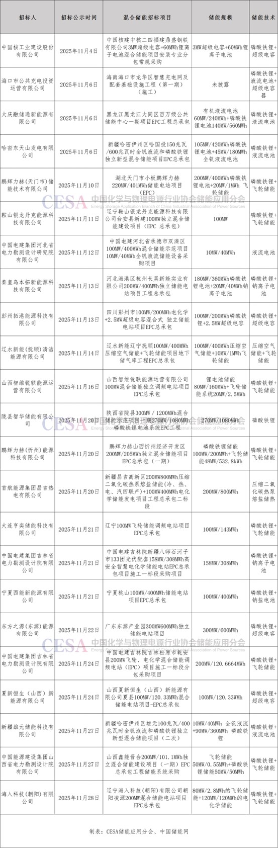 表 2025年11月國(guó)內(nèi)新增混合儲(chǔ)能招標(biāo)項(xiàng)目部分案例