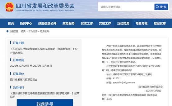 中國儲能網訊:12月8日,四川發(fā)改委發(fā)布《四川省有序推動綠電直連發(fā)展實施細則(征求意見稿)》。