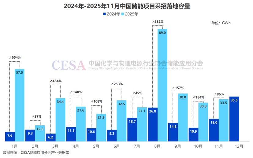 中國儲能網(wǎng)訊:2025年11月,CESA儲能應用分會共追蹤到322個儲能采招落地項目,其中包括儲能EPC/PC、儲能系統(tǒng)、儲能電芯、BMS、PCS、EMS等采購以及研發(fā)、設計、施工、運營、容量租賃等全流程招標項目。其中,11月儲能EPC/PC(含直流側設備)、儲能系統(tǒng)、儲能電芯采招落地總規(guī)模達11.5GW/33.5GWh,容量規(guī)模同比增長86%,環(huán)比+9%。
