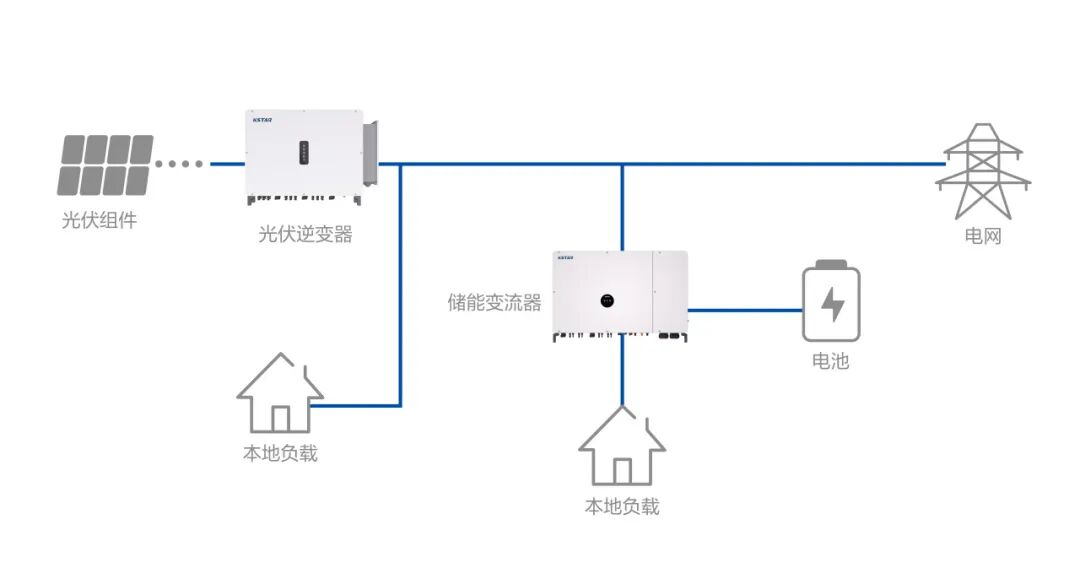 關(guān)鍵點(diǎn):光伏給儲(chǔ)能電池充電時(shí),電能必須經(jīng)歷“直流→交流→直流”的兩次轉(zhuǎn)換,系統(tǒng)靈活性高,交流功率可以適當(dāng)疊加增大,但存電時(shí)轉(zhuǎn)換損耗相對(duì)較大。
