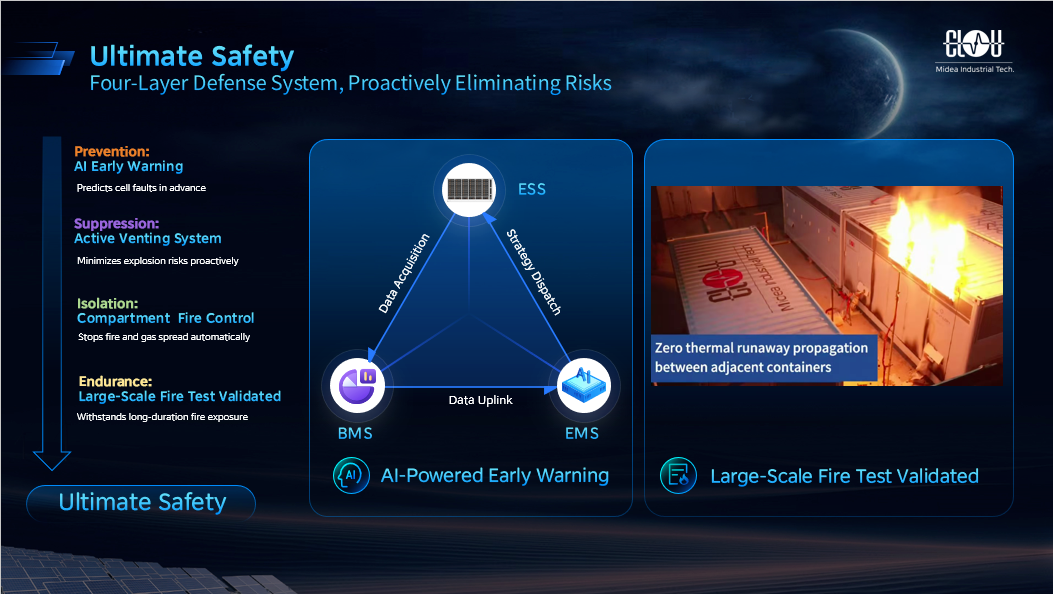 面對(duì)日本地震多發(fā)的地質(zhì)特點(diǎn),Aqua-C2.5系列滿足IEEE 693高抗震標(biāo)準(zhǔn),可輕松應(yīng)對(duì)當(dāng)?shù)乜拐鸺斑\(yùn)輸要求。系統(tǒng)還通過電芯故障告警、主動(dòng)通風(fēng)泄爆系統(tǒng)降低燃爆風(fēng)險(xiǎn)、獨(dú)立分倉滅火,以及長(zhǎng)時(shí)耐火3小時(shí)以上設(shè)計(jì)構(gòu)建四級(jí)安全防御體系,保障系統(tǒng)極致安全。