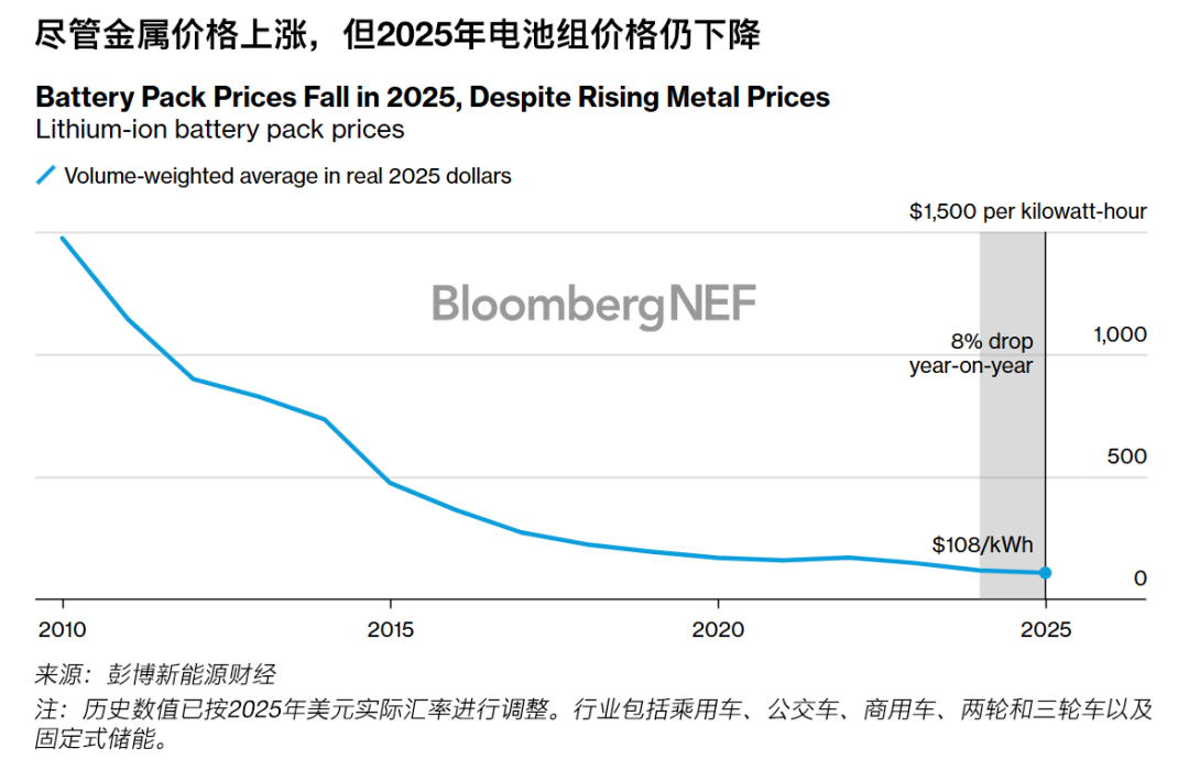 彭博新能源財經(jīng)的年度電池價格調(diào)研顯示,2025年鋰離子電池組的容量加權(quán)均價為108美元/kWh,同比下降8%。價格下降主要源于電芯產(chǎn)能持續(xù)過剩、市場競爭激烈,以及向低成本磷酸鐵鋰(LFP)電池持續(xù)轉(zhuǎn)型。今年的價格調(diào)研包括來自新能源乘用車、新能源公交車、新能源商用車、兩輪和三輪車以及固定式儲能的320個數(shù)據(jù)點。