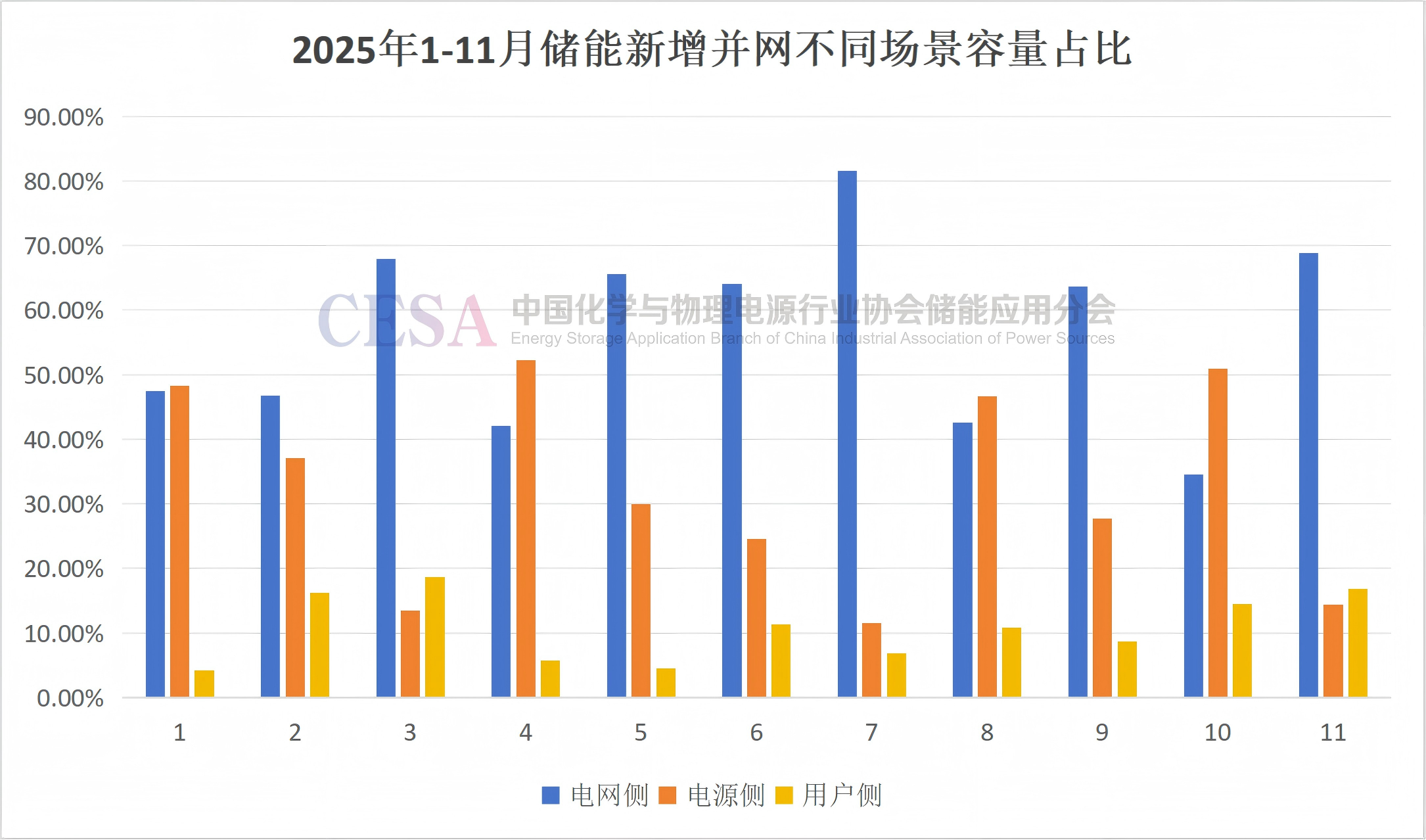 按月份來看,增長勢頭更為清晰。前11個月中,獨立儲能在3月、5月、6月、7月、9月、11月等六個月份占比均超過60%。
