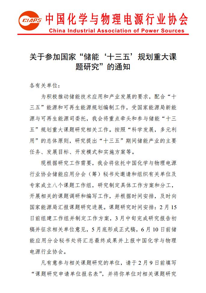 現(xiàn)根據(jù)研究工作需要,我會(huì)將依托中國(guó)化學(xué)與物理電源行業(yè)協(xié)會(huì)儲(chǔ)能應(yīng)用分會(huì)(籌)秘書(shū)處邀請(qǐng)和組織有關(guān)單位及專(zhuān)家成立八個(gè)課題工作組,研究制定具體工作方案和分工,開(kāi)展相關(guān)的課題調(diào)研和編寫(xiě)工作,并根據(jù)時(shí)間安排,及時(shí)向國(guó)家能源局匯報(bào)課題研究進(jìn)展。課題研究時(shí)間安排:2月15日前組建工作組并制定工作方案,3月中旬完成研究報(bào)告初稿并征求相關(guān)單位意見(jiàn),5月底形成正式稿,6月10日前,儲(chǔ)能應(yīng)用分會(huì)(籌)秘書(shū)處將匯總最終成果并上報(bào)中國(guó)化學(xué)與物理電源行業(yè)協(xié)會(huì)。