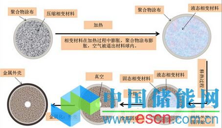 對于該儲熱球的制造和封裝工序,研究人員首先采用液壓機(jī)將這種粉狀相變蓄熱材料壓縮,然后用一種低成本、可硬化并具有高滲透率的聚合物涂布將壓縮后的相變材料包裹起來,再通過加熱工序,使相變材料膨脹,聚合物涂布膨脹將空氣逼出材料球內(nèi),形成真空。再通過放熱過程,相變材料在球體內(nèi)由外向內(nèi)冷卻成為固態(tài),因空氣在加熱過程中被逼出,中心部位形成真空狀態(tài),然后采用電鍍或高溫?zé)Y(jié)技術(shù)將包裹起來的相變儲熱球封裝一層金屬外殼或者陶瓷外殼。(見圖1)