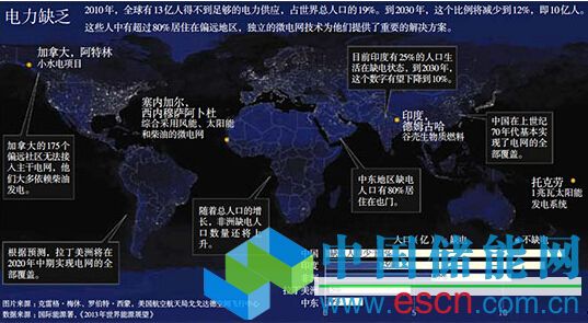 在西半球電氣化程度最低的國(guó)家——海地,部分居民每月需要花費(fèi)10美元購(gòu)買蠟燭和煤油,用做家庭照明,這大概是美國(guó)普通家庭同類支出的125倍。許多印度居民需要支付額外費(fèi)用,才能通過汽車電池為手機(jī)充電。在非洲,日光仍然是數(shù)百萬(wàn)當(dāng)?shù)鼐用竦闹饕彰鞣绞健R恍┨窖髰u嶼為滿足電力需求,不得不花費(fèi)額外費(fèi)用使用柴油發(fā)電機(jī)。目前,全球約有13億人無(wú)法獲得足夠的生活用電,雖然電網(wǎng)也在不斷擴(kuò)展,但與很多人仍相距遙遠(yuǎn)。