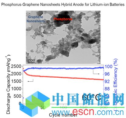 針對這一問題,最近美國賓夕法尼亞州立大學(xué)(The Pennsylvania State University)王東海教授領(lǐng)導(dǎo)的,以于昭新、宋江選為主的科研梯隊發(fā)明了一種新型鋰離子電池負(fù)極材料:“紅磷-石墨烯”納米復(fù)合材料。該種材料是由紅磷和石墨經(jīng)球磨制備得到。紅磷化學(xué)穩(wěn)定性高,廉價易得,而且環(huán)境友好。其作為鋰離子電池負(fù)極材料的理論容量可達(dá)2600 mAh/g,7倍于商用石墨電極。 石墨/石墨烯因其極高的電子電導(dǎo)率被引入到該體系中以提升納米復(fù)合材料整體的電子電導(dǎo)率。在高速球磨過程中,微米級的紅磷顆粒被打碎至納米級。石墨在球磨 過程中剝離為大比表面積的石墨烯。經(jīng)過長時間機械力作用,石墨烯相互搭接形成一個緊密結(jié)合的三維導(dǎo)電網(wǎng)絡(luò),而納米級紅磷顆粒均勻分散在該網(wǎng)絡(luò)中。紅外光譜 (Infrared Spectroscopy)測試顯示,紅磷和石墨烯以“磷-氧-碳 (P-O-C)”的化學(xué)鍵形式結(jié)合在一起,這又為該材料出眾的電池性能提供了保證。在室溫下,該納米復(fù)合材料的放電容量可達(dá)1400mAh/g, 4倍于現(xiàn)行商用化鋰離子電池負(fù)極材料–石墨。 經(jīng)過300周的循環(huán),放電容量仍然能保持在60%以上。高溫環(huán)境(60°C)對于現(xiàn)行商用鋰離子電池仍是很大的挑戰(zhàn)。而該種材料,在60°C下,放電容量 可進(jìn)一步提升至1650mAh/g。經(jīng)過200周循環(huán),放電容量保持率可在70%以上。