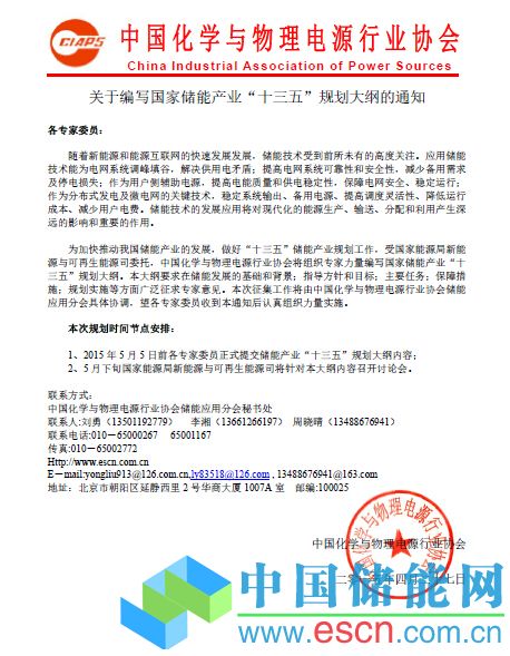 為加快推動(dòng)我國(guó)儲(chǔ)能產(chǎn)業(yè)的發(fā)展,做好“十三五”儲(chǔ)能產(chǎn)業(yè)規(guī)劃工作,受國(guó)家能源局新能源與可再生能源司委托,中國(guó)化學(xué)與物理電源行業(yè)協(xié)會(huì)將組織專家力量編寫(xiě)國(guó)家儲(chǔ)能產(chǎn)業(yè)“十三五”規(guī)劃大綱。本大綱要求在儲(chǔ)能發(fā)展的基礎(chǔ)和背景;指導(dǎo)方針和目標(biāo);主要任務(wù);保障措施;規(guī)劃實(shí)施等方面廣泛征求專家意見(jiàn)。本次征集工作將由中國(guó)化學(xué)與物理電源行業(yè)協(xié)會(huì)儲(chǔ)能應(yīng)用分會(huì)具體協(xié)調(diào),望各專家委員收到本通知后認(rèn)真組織力量實(shí)施。