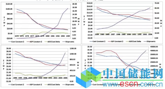 圖1顯示了1974-2014年間,光伏組件成本,價(jià)格,出貨量以及平均售價(jià)/成本變化。