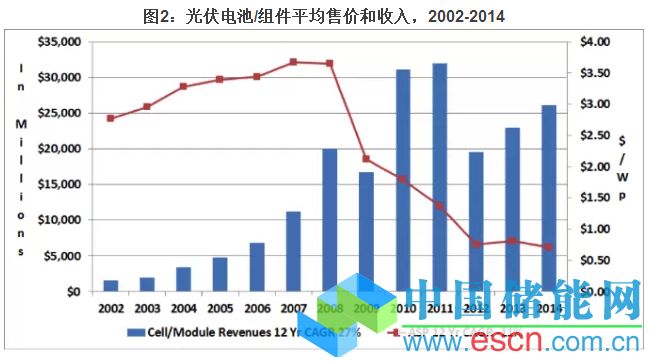 圖2給出了2002-2014間光伏電池/組件的收入以及平均售價(jià)。