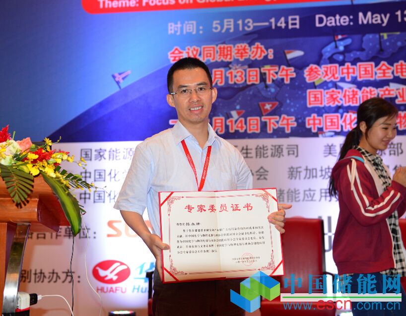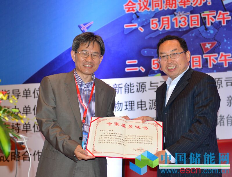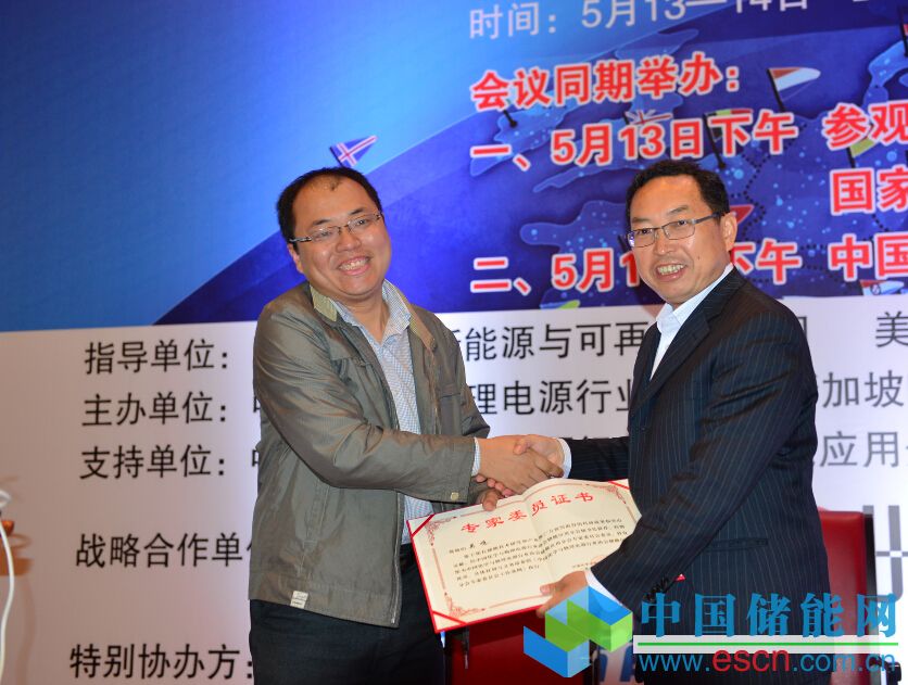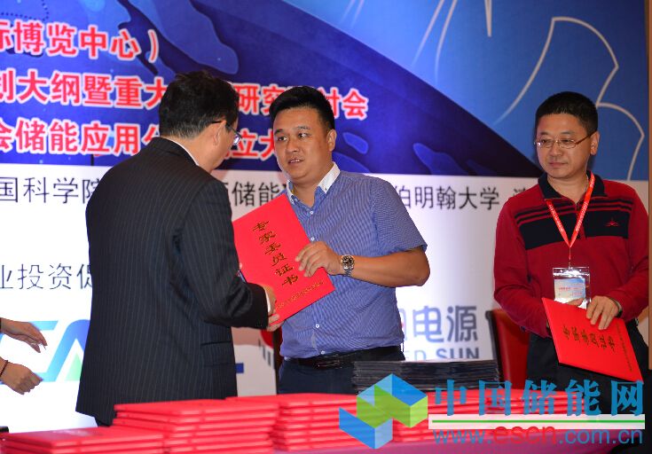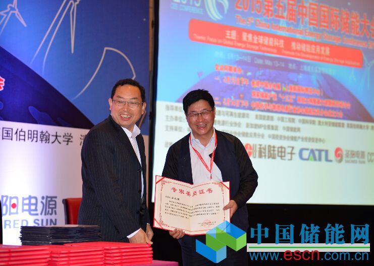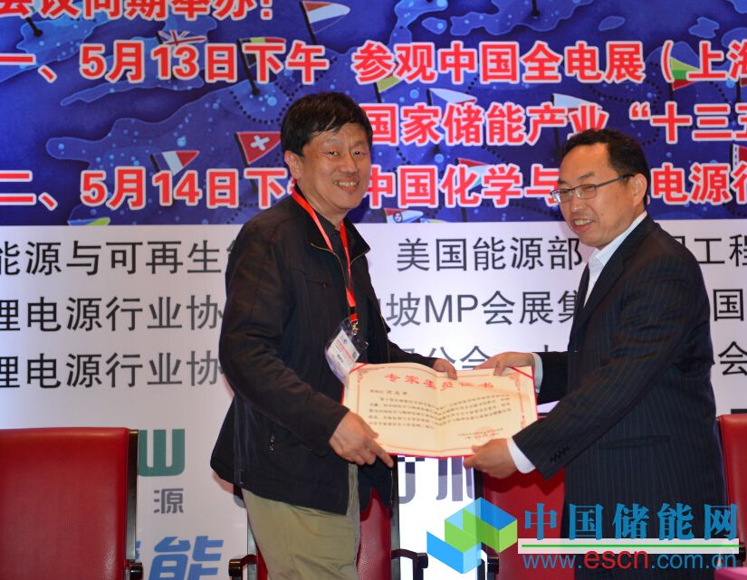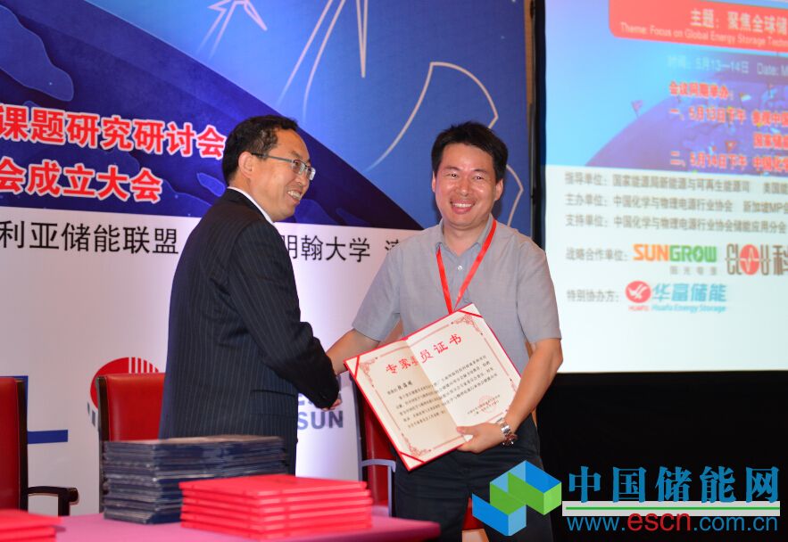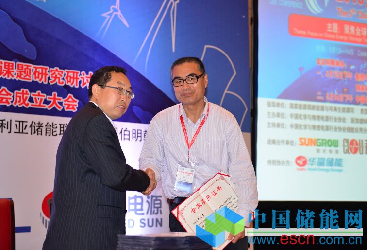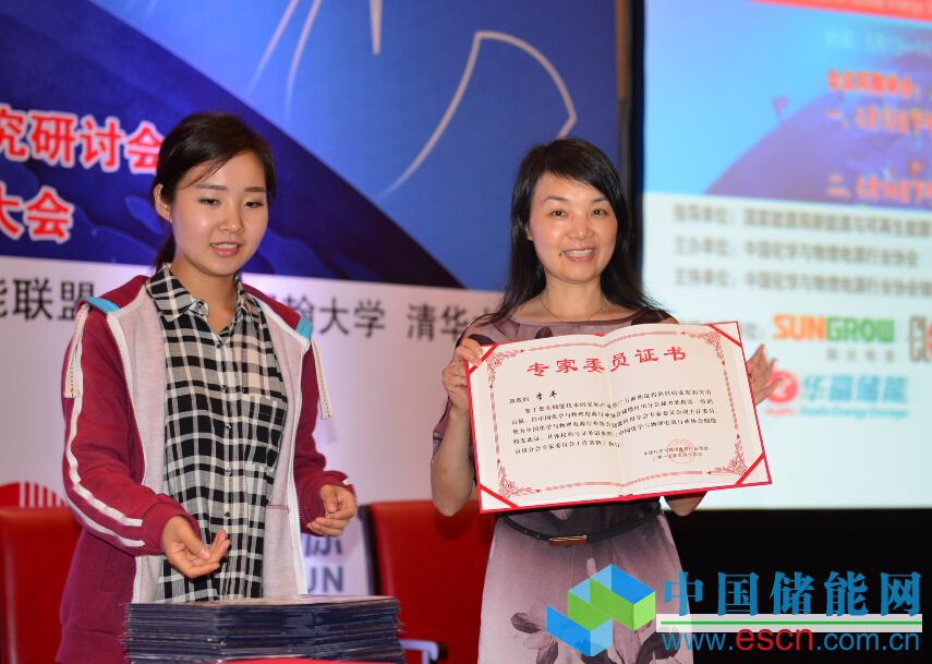 中國(guó)化學(xué)與物理電源行業(yè)協(xié)會(huì)秘書長(zhǎng)為儲(chǔ)能應(yīng)用分會(huì)專家委委員頒發(fā)證書。