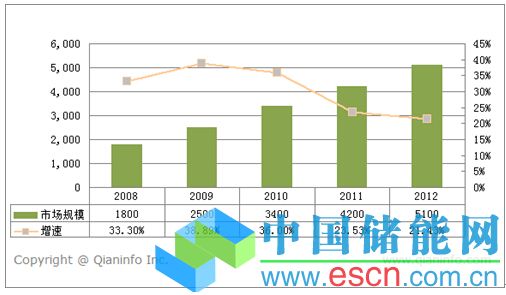 圖表12008-2012年光伏行業(yè)市場規(guī)模及增速(單位:億元)