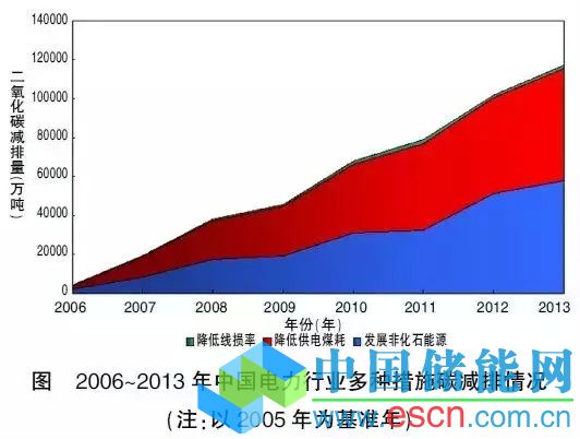 電廠二氧化碳捕集、利用、埋存的試點(diǎn)取得了成功經(jīng)驗(yàn)。燃煤或燃?xì)怆姀S煙氣中的二氧化碳捕集能力為3000噸/年到12萬噸/年的幾個試點(diǎn)項(xiàng)目在運(yùn)行;二氧化碳埋存的地質(zhì)調(diào)查也做了大量工作;基于工程項(xiàng)目的燃煤電廠富氧燃燒捕集二氧化碳的國際合作研究有效開展。中國通過發(fā)展非化石能源、降低煤耗和線損率等措施,以2005年為基準(zhǔn)年,2006~2014年,累計減排二氧化碳約60億噸,2014年單位發(fā)電量二氧化碳排放量比2005年降低了19%。根據(jù)作者的相關(guān)研究,電力二氧化碳減排的貢獻(xiàn)見下圖。