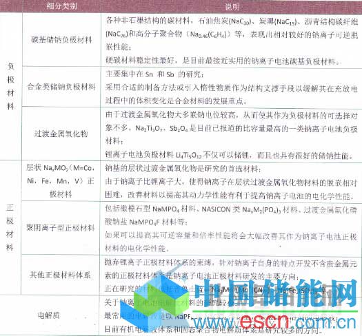 通過(guò)借鑒鋰離子電池材料研宄經(jīng)驗(yàn),鈉離子電池材料研究近年來(lái)進(jìn)展較多、技術(shù)發(fā)展較快。鈉離子電池研發(fā)的關(guān)鍵在于材料的開(kāi)發(fā),開(kāi)發(fā)長(zhǎng)壽命電池的關(guān)鍵是開(kāi)發(fā)出具備可逆脫/嵌鈉離子特性的材料,包括正極材料、負(fù)極材料和電解質(zhì)。一些典型的鈉離子電池正負(fù)極材料、電解質(zhì)材料如表1示。