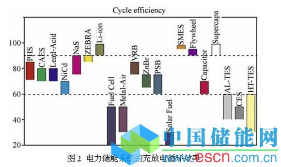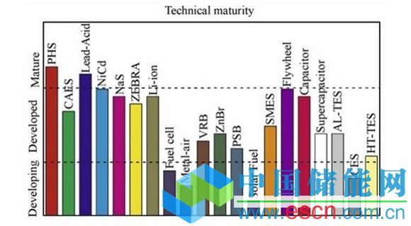PHS-抽水蓄能;CAES-壓縮空氣;Lead-Acid:鉛酸電池;NiCd:鎳鎘電池;NaS:鈉硫電池;ZEBRA:鎳氯電池;Li-ion:鋰電池;Fuelcell:燃料電池;Metal-air:金屬空氣電池;VRB:液流電池;ZnbBr:液流電池;PSB:液流電池;SolarFuel:太陽能燃料電池;SMES:超導儲能;Flywheel:飛輪;Capacitor/Supercapcitor:電容/超級電容;AL-TES:水/冰儲熱/冷系統(tǒng);CES:低溫儲能系統(tǒng);HT-TES:儲熱系統(tǒng)。
