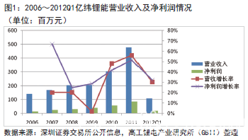 公司在2012年5月10日宣布3個加快鋰離子電池布局的措施,首先與杭州賽恩斯有限公司合資成立廣東億緯賽恩斯新能源系統(tǒng)有限公司(億緯鋰能占70%股份),主要推動電動車電池及系統(tǒng)技術(shù)在廣東省的應(yīng)用化與市場化;其次公司在湖北省荊門市設(shè)立全資子公司湖北金泉新材料,主要生產(chǎn)鋰原電池及鋰離子電池材料;再次公司擬使用4500萬元超募資金擴(kuò)大現(xiàn)有鋰離子電池產(chǎn)能,項目實施后公司鋰離子電池產(chǎn)能將由現(xiàn)有的1250萬安時擴(kuò)大為3000萬安時。從這一系列措施中可以看出鋰離子電池將成為在公司未來3年增長的主要動力之一。但是從公司的近三年經(jīng)營情況分析,鋰離子電池在公司收入和盈利占比逐年降低(如圖7所示),而且2011年鋰離子電池毛利率僅有10.23%,遠(yuǎn)低于鋰原電池33.57%的毛利率,這說明公司在鋰離子電池生產(chǎn)和市場方面幾乎沒有優(yōu)勢。