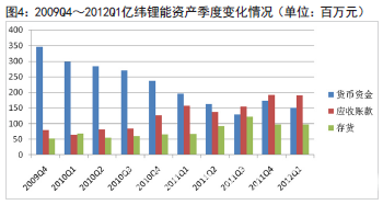 根據(jù)GBII統(tǒng)計數(shù)據(jù)顯示,公司貨幣資金由2009年第四季的3.46億元,減少至2012年第一季度的1.51億元(如圖4所示),這與公司營業(yè)收入情況截然相反;這雖然有公司募投項目建設(shè)資金投入的原因,但更主要是公司存貨、應(yīng)收賬款占用了公司的大部分流動資產(chǎn)。公司存貨由2009年末5164萬元增長至2012年第一季度9746萬元,應(yīng)收賬款2009年末7837萬元增長至2012年第一季度1.91億元(如圖4所示)。這些數(shù)據(jù)都表明億緯鋰能在快速發(fā)展過程中積聚了巨大的流動性風(fēng)險。